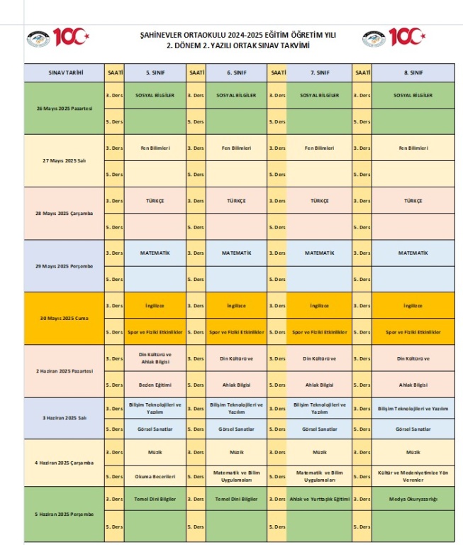 2. Dönem 2. Yazılı Ortak Sınav Takvimi